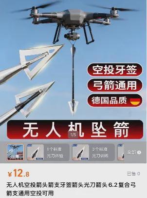 在采购和使用环节,无人机尚且有《无人驾驶航空器飞行管理暂行条例》进行监管,而常常搭配无人机使用的坠箭,任何人在主流电商平台搜索“空投牙签”“无人机牙签”,就能搜到一大把,价格从几元到一百多元,其中就有那种超过700克、能够射穿大型哺乳动物身体的重型金属箭,买方甚至可以为这些坠箭搭配更加锋利的金属箭头。
