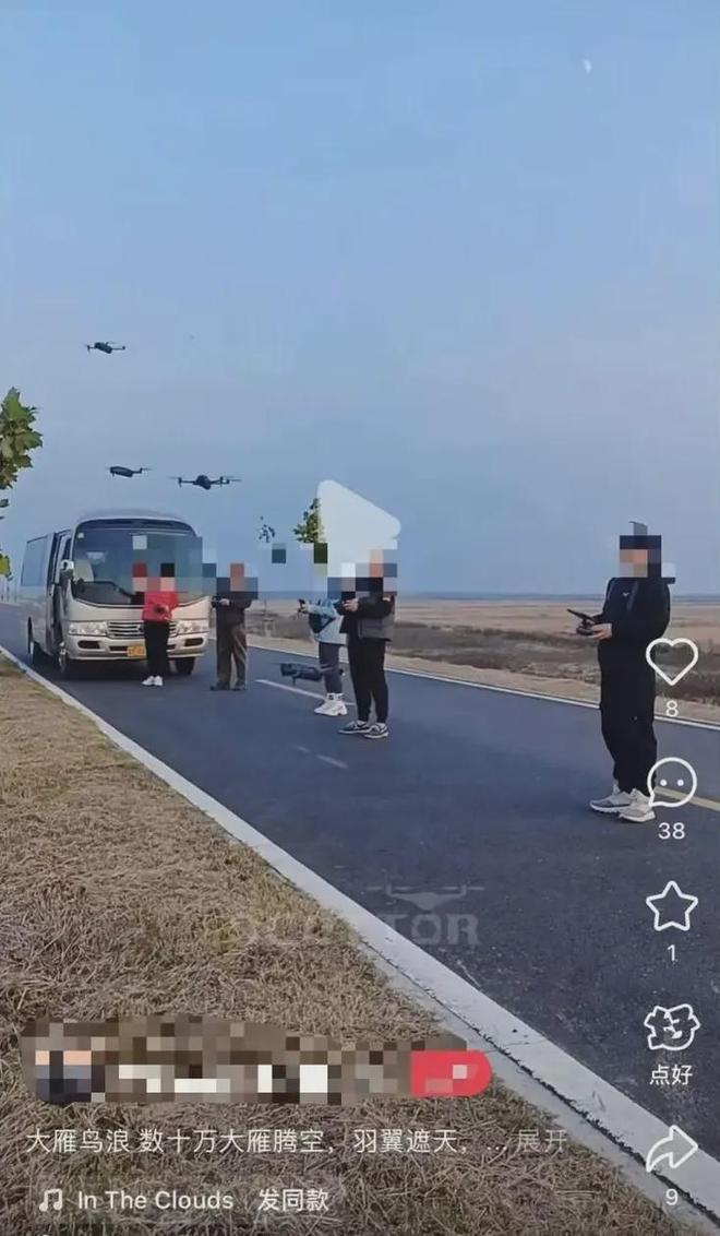 11月1日,在黄河口三角洲湿地的一场鸟浪中,至少有4架无人机低飞追随候鸟进行拍摄,几乎就要冲入鸟浪中。其中一架无人机撞到了大雁(即鸿雁),“砰”的一声,“一架无人机和一只大雁一起掉了下来”,一名目击者表示。