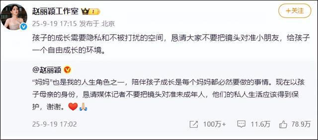 随后,赵丽颖工作室转发微博称:孩子的成长需要隐私和不被打扰的空间,恳请大家不要把镜头对准小朋友,给孩子一个自由成长的环境。