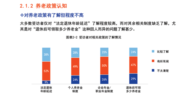 一方面,高达八成的受访者表示已开始关注并思考自己的晚年规划;但另一方面,这种关注并未转化为深入的了解。九成的受访者对“法定退休年龄延迟”这样的宏大议题有所耳闻,但当涉及到“退休后能领多少钱”这个最切身的问题时,真正“比较了解”的比例却骤降至24%。