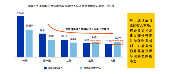 但如果深入数据,会发现一个更值得警惕的信号。这张“晚年图景”并非铁板一块,而是随着城市下沉,理想与现实的缺口正在逐渐扩大。在一线、新一线城市,人们对退休后的收入下降已有预期;然而,在三线及以下城市,人们不仅期望生活水平不降级,甚至期待收入更高。