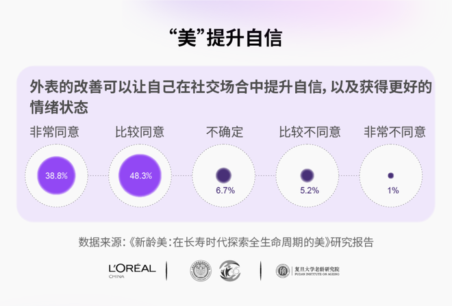 《新龄美:在长寿时代探索全生命周期的美》研究报告也证明这一点:在受访的人群中,有高达87.1%的人认为,外表的改善能提升自己在社交场合中的自信,并带来更好的情绪状态。人们认同“美”的现实价值——美既是个体健康的外在表现,也是心理平衡的内在力量。