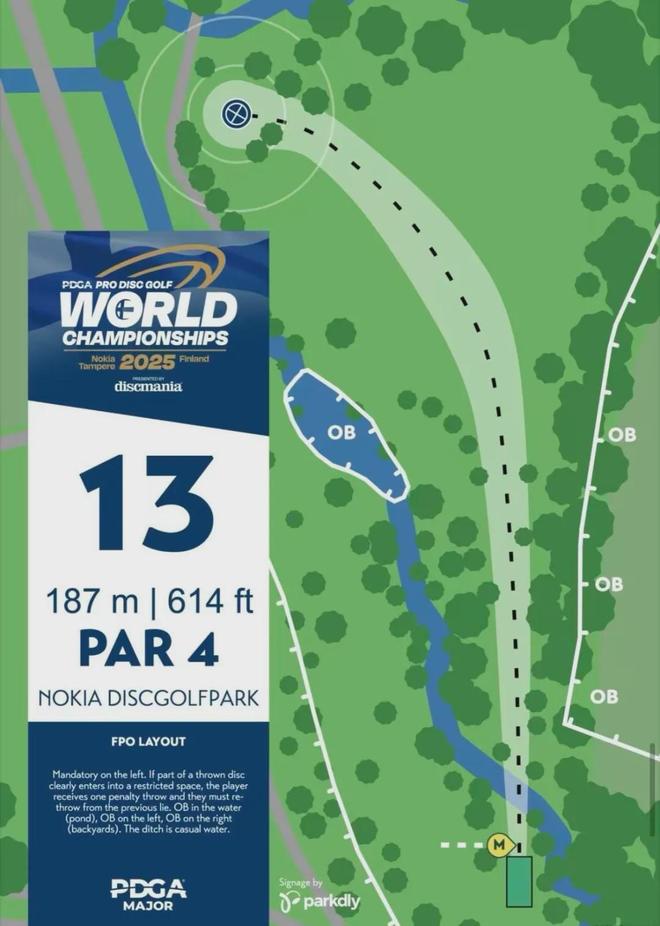 2025年高尔夫飞盘世锦赛的第13洞,共187米,飞盘掉进湖中或飞到白线外都算出界。(图/网页截图)