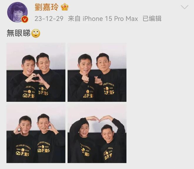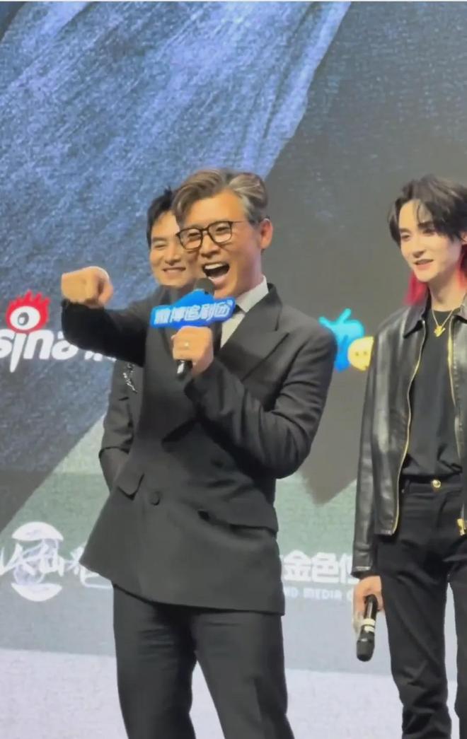 《金手指》路演现场,加起来一百多岁的两位影帝被要求比心卖腐,刘嘉玲都直言“没眼看”。(图源:微博)