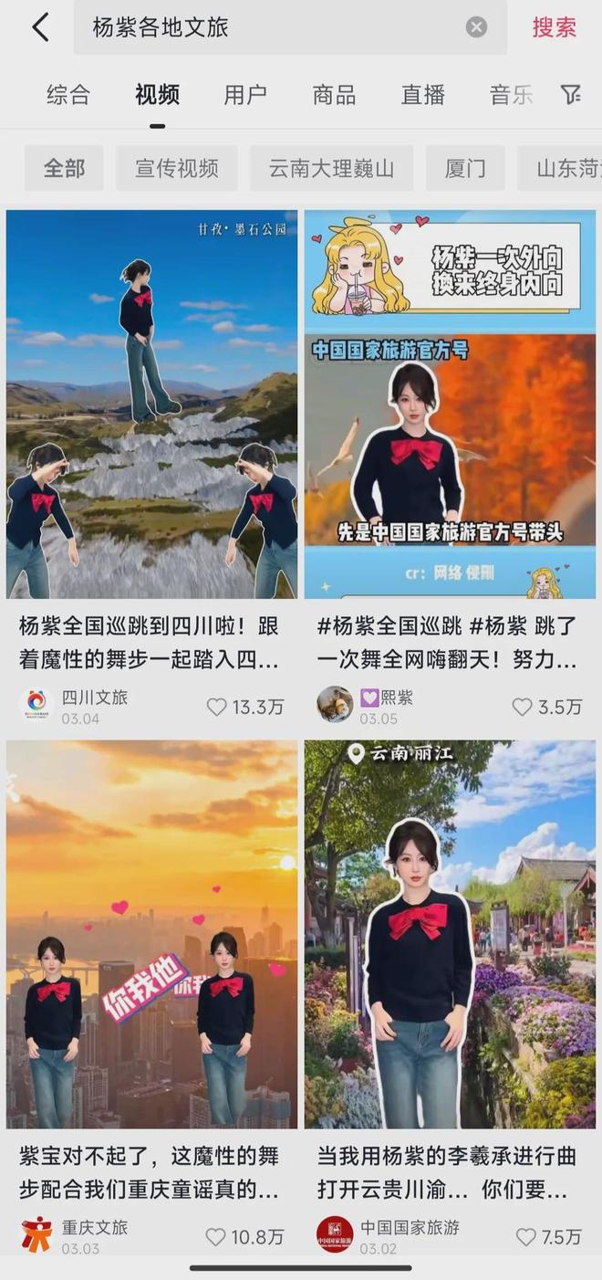 而紧随其后的杨紫就没那么幸运了。为宣传《国色芳华》,她也伴随咚咚咚的洗脑魔音,小舞了一段。这段杨紫本人都要抱拳求饶的表演,被十余个省级文旅官方账号借势二创。在PS抠图大法的加持下,以“土到极致就是潮”的上头之势火遍全国。