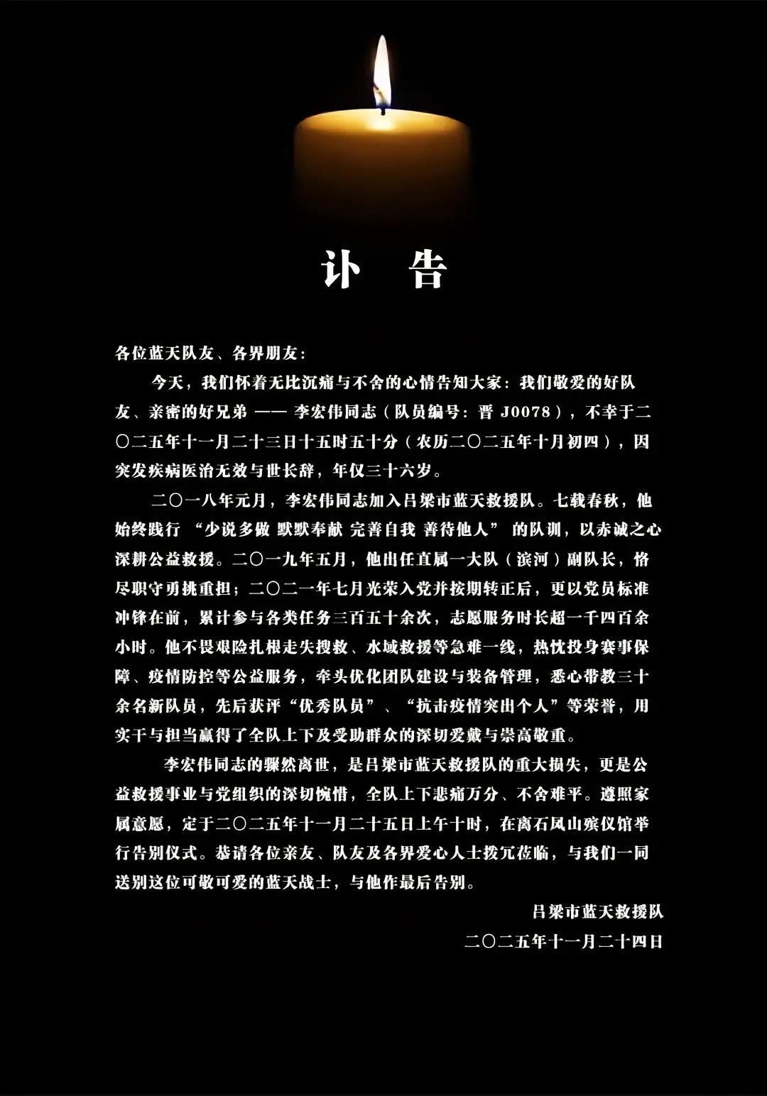 吕梁市蓝天救援队发布的讣告显示,李宏伟于2025年11月23日15时50分,因突发疾病医治无效与世长辞,年仅36岁。李宏伟2018年1月加入吕梁市蓝天救援队,累计参与各类任务350余次,志愿服务时长超1400小时。他不畏艰险扎根走失搜救、水域救援等急难一线,热忱投身赛事保障等公益服务,牵头优化团队建设与装备管理,悉心带教三十余名新队员,用实干与担当赢得了全队上下及受助群众的深切爱戴与崇高敬重。