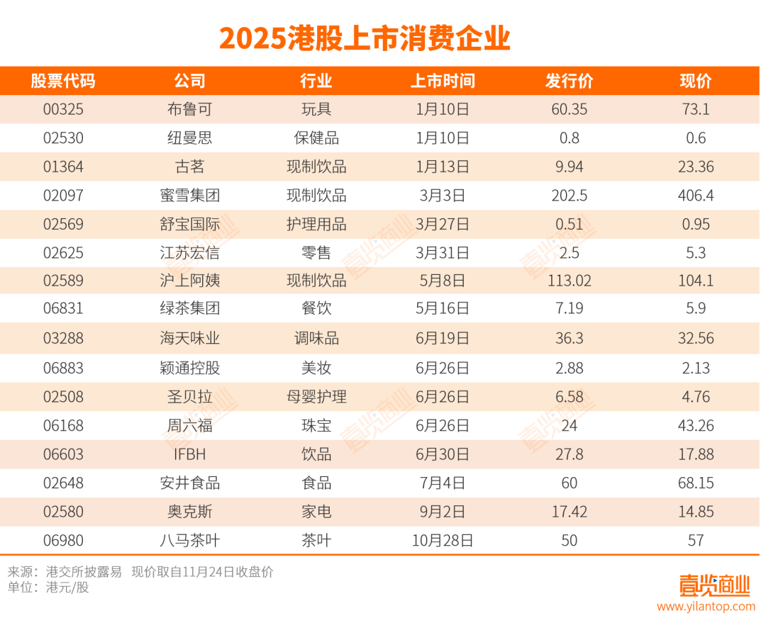 根据普华永道数据,2025年上半年港股新上市公司中,零售、消费品及服务类占比高达34%。据壹览商业不完全统计,从年初至10月底,已有至少15家消费类企业成功登陆港交所,涵盖饮品、食品、母婴个护、调味品、餐饮零售等多个细分行业。