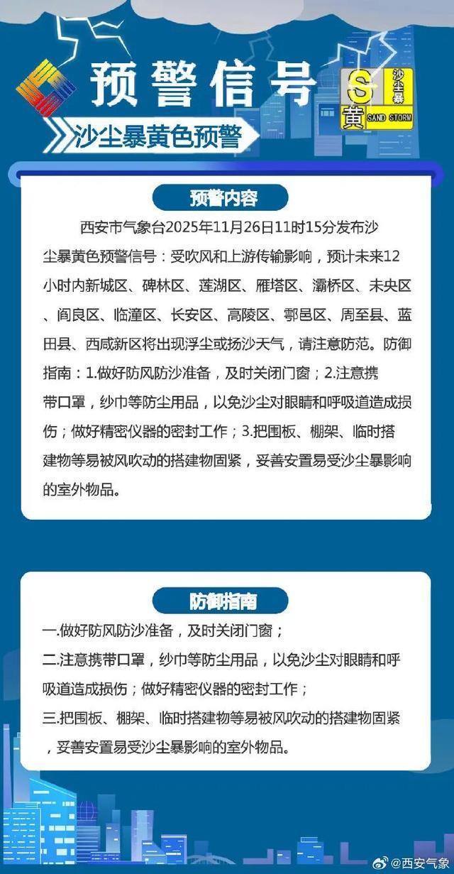 西安市气象台2025年11月26日11时15分发布沙尘暴黄色预警信号:受吹风和上游传输影响,预计未来12小时内新城区、碑林区、莲湖区、雁塔区、灞桥区、未央区、阎良区、临潼区、长安区、高陵区、鄠邑区、周至县、蓝田县、西咸新区。