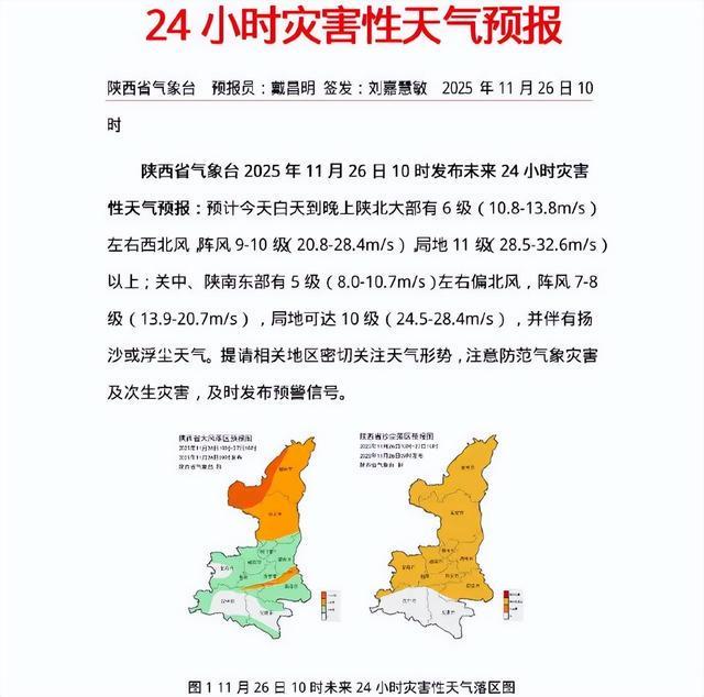 受较强冷空气影响,11月26日陕西有明显降温吹风过程。陕北、关中、陕南东部部分地方阵风风力较大,局地可达9级以上,并伴有扬沙或浮尘天气。