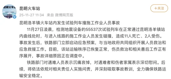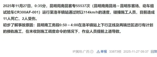 11月27日,网传信息显示,2025年11月27日,0:35分,昆明局南昆客专55537次(昆明南南昆场~昆明东客场、动车组试验车CR300AF-001)运行至洛羊镇站通过时以114km/ h 的速度碰撞施工人员,目前造成11人死亡、2人受伤。初步了解事故原因:昆明南工务段0:50~4:00在洛羊镇站上下行正线及两端岔区进行有计划的换轨施工,在未收到施工调度命令的情况下,作业人员提前上道导致。