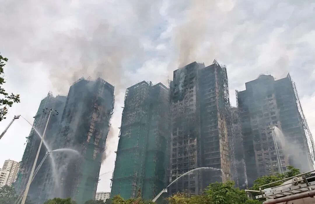 11月27日9时,记者在香港大埔火灾现场看到,多栋楼宇明火已逐渐被扑灭,但仍有数处火点。