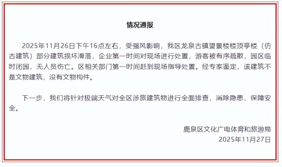 2025年11月26日下午16点左右,受强风影响,我区龙泉古镇望景楼楼顶亭楼(仿古建筑)部分建筑损坏滑落,企业第一时间对现场进行处置,游客被有序疏散,园区临时闭园,无人员伤亡。区相关部门第一时间赶到现场指导处置。经专家鉴定,该建筑不是文物建筑,没有文物构件。