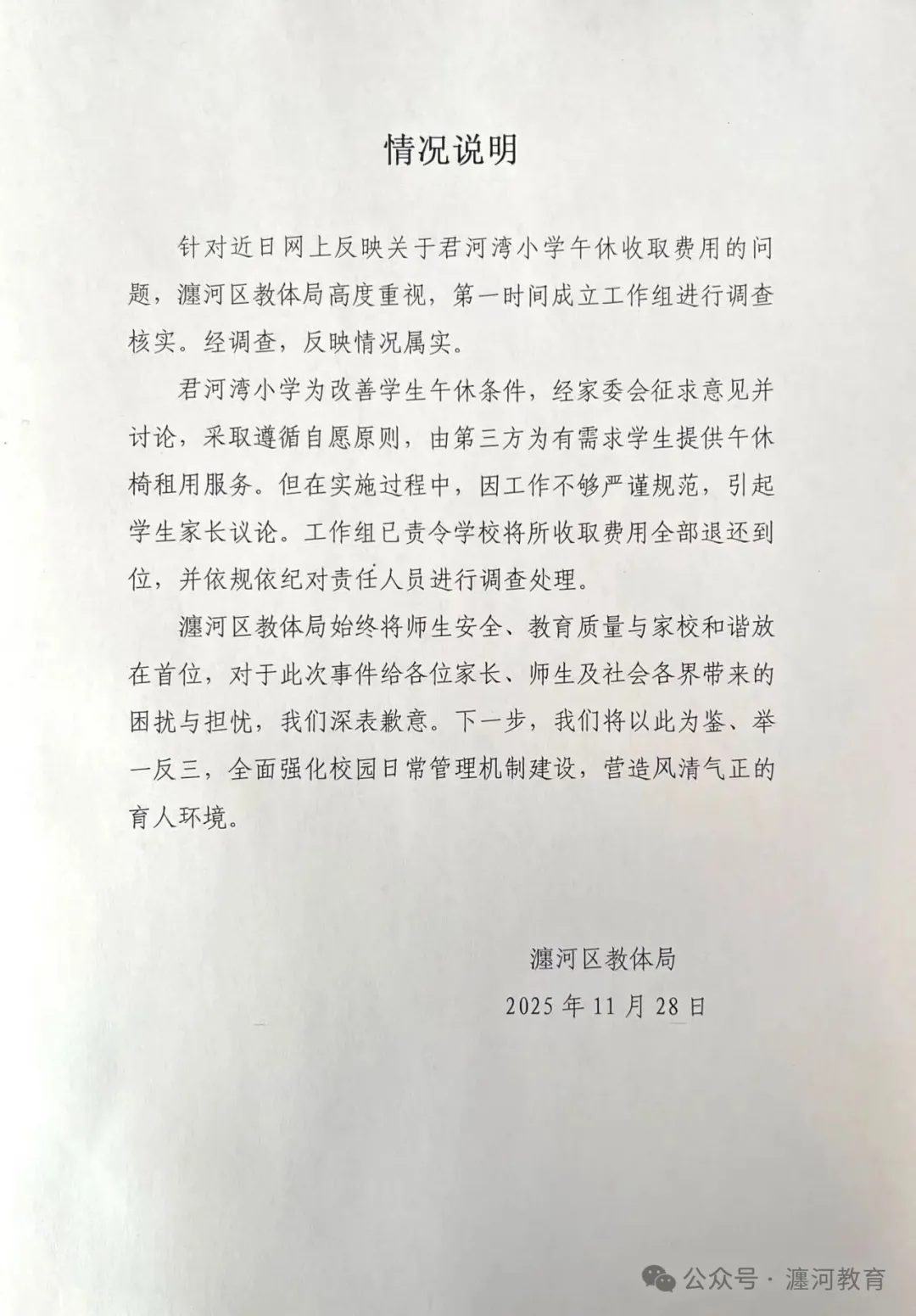 君河湾小学为改善学生午休条件,经家委会征求意见并讨论,采取遵循自愿原则,由第三方为有需求学生提供午休椅租用服务。但在实施过程中,因工作不够严谨规范,引起学生家长议论。工作组已责令学校将所收取费用全部退还到位,并依规依纪对责任人员进行调查处理。