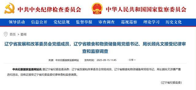 9月15日,据中央纪委国家监委网站消息:辽宁省发展和改革委员会党组成员,辽宁省粮食和物资储备局党组书记、局长顾兆文涉嫌严重违纪违法,目前正接受辽宁省纪委监委纪律审查和监察调查。