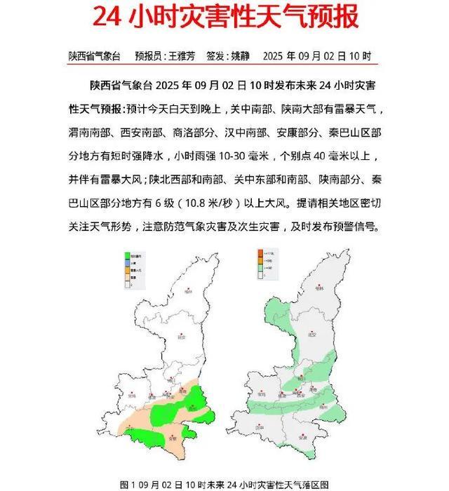 预计2025年09月02日09时至2025年09月03日09时,西安市灞桥区、临潼区、长安区、蓝田县,咸阳市三原县、泾阳县、礼泉县、兴平市,渭南市临渭区、华州区、潼关县、大荔县、富平县、华阴市,汉中市南郑区、镇巴县,商洛市商州区、洛南县等县(市、区)发生山洪灾害可能性较大(黄色预警),西安市鄠邑区、周至县,宝鸡市太白县,咸阳市乾县、淳化县、武功县,铜川市耀州区,渭南市合阳县、蒲城县,汉中市汉台区、城固县、洋县、西乡县、勉县、宁强县、留坝县、佛坪县,安康市汉阴县、石泉县、宁陕县、紫阳县,商洛市商南县、镇安县、柞水县等县(区)有可能发生山洪灾害(蓝色预警)。请各地各部门落实防御责任,紧盯危险区与强降雨重叠区,加强实地监测与预警叫应,提前做好转移避险防范。