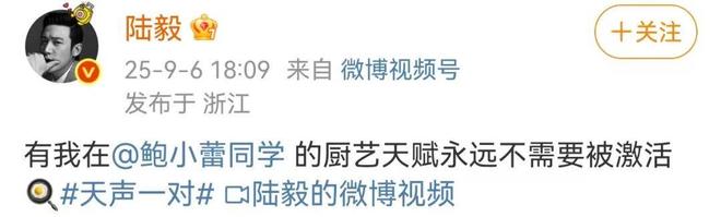 随后,陆毅在社交平台隔空恩爱互动:有我在,你的厨艺天赋永远不需要被激活。