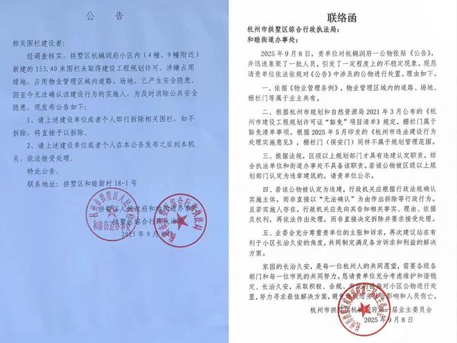 9月8日,小区内贴出了新的公告。公告称,“新建的153.40米围栏未取得建设工程规划许可,涉嫌占用绿地、占用物业管理区域内道路、场地,已产生安全隐患”,要求即刻拆除,关于错配问题则没有进一步回应和处理。