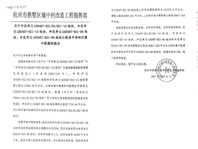 杭樾润府的业主向政府申请信息公开,收到杭州市拱墅区城中村改造工程指挥部2021年的一份文件。文件指出,杭樾润府及另外三个楼盘地块需配的公租房以相对集中配建的形式落实在杭樾润府的地块。业主表示在购房时并未被告知这些具体细则。(图/由受访者提供)