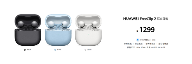 华为FreeClip 2 耳夹耳机2025年10月14日10:08开启预售,10月20日10:08正式开售,首发价格1299元,用户可登陆华为商城及各大授权电商平台或前往华为体验店、华为授权零售门店进行购买。