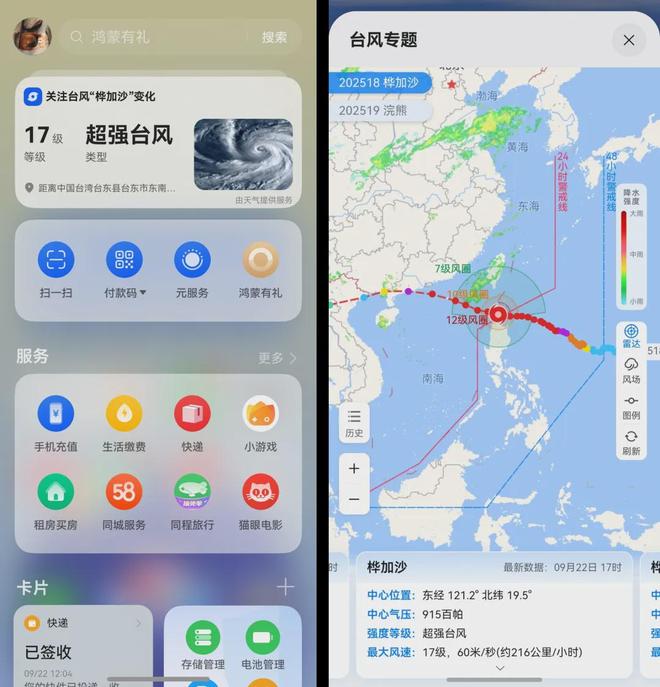即便是因为特殊原因而坚守工位的打工人,也能右滑至负一屏的服务动态卡片及时get重要信息,快递、外卖等信息一目了然。最近台风过境,负一屏台风动态卡片就为打工人们实时展示了台风等级,点击后还可以查看台风路径,提前做好准备。
