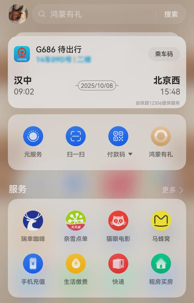 像小李这样把国庆计划做得满满当当的规划达人,最担心的便是在杂乱的信息中遗漏了任何细节。但这次出行前,她早早便在负一屏顶部的服务动态管理中关联了自己的铁路12306账号。这样一来,仅通过一个简单的“右滑”动作,她便能直接查看自己的行程信息,出发日期、车次、发车时间、检票口等一览无余,再也不用时不时点进APP反复确认。