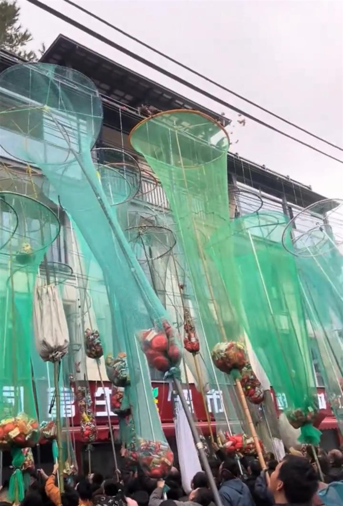 浙江义乌新房封顶庆祝活动,房主抛撒零食红包,村民用渔网接喜糖传统升级了