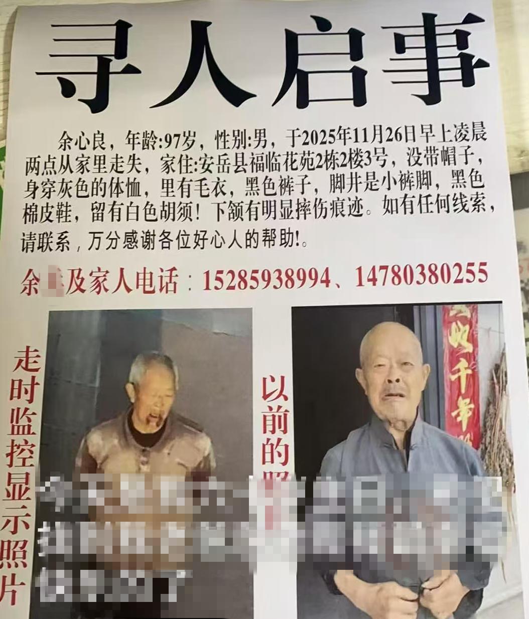 四川安岳97岁老人离家走失两天,女儿紧急寻找,父亲外出未穿外套,担忧生存状况 四川安岳一名97岁的老人在两天前离家走失,至今下落不明,老人的女儿非常着急,因为老人出门时并未穿上外套,担心他遭受寒冷和饥饿的困扰,家人已经展开了广泛的寻找行动,呼吁社会各界人士提供线索,希望能尽快找到老人的踪迹,确保他的安全,这一事件引起了广泛关注,人们纷纷为老人祈祷,希望他能平安归来。...