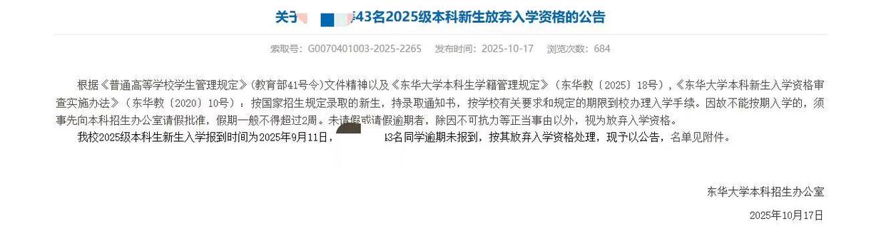 东华大学新生放弃入学资格引发争议,校方公示学生姓名引热议标题建议,东华大学公示新生放弃入学资格名单引争议,律师称行为合理 东华大学有43名新生决定放弃入学资格,引发社会关注,校方公示了放弃入学资格学生的姓名,这一做法引发了争议,对此,律师表示,校方的行为具有合理性,东华大学近期公告显示,共有43名新生放弃入学资格,此举引起社会热议,尤其是校方公示放弃入学学生姓名的做法备受争议,对此,法律专业人士认为,校方的行为符合相关...
