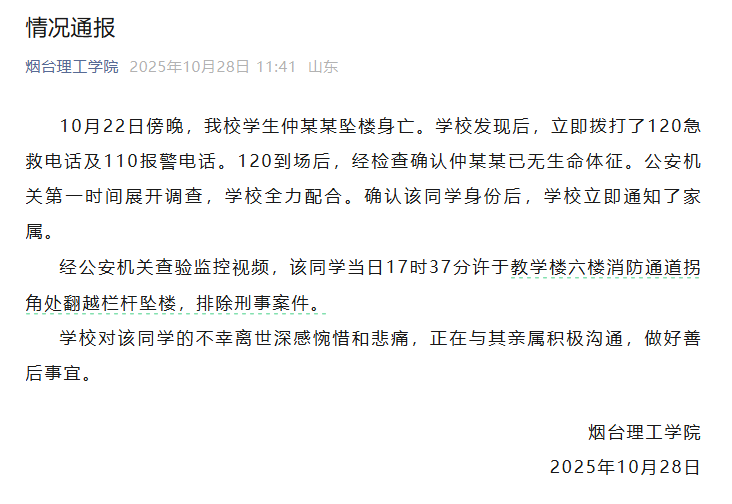 烟台理工学院学生仲某某坠楼身亡事件通报,排除刑事案件 烟台理工学院通报学生仲某某坠楼身亡事件,经过调查排除刑事案件的可能,学校已经成立了专门的工作组,对学生家属及善后事宜进行了妥善安排和处理,此次事件引起了广泛关注,学校和社会各界都在关注着学生的安全与健康,此次事件也提醒社会各界要高度重视校园安全问题,加强对学生心理健康的关注和关怀,共同营造一个安全、...