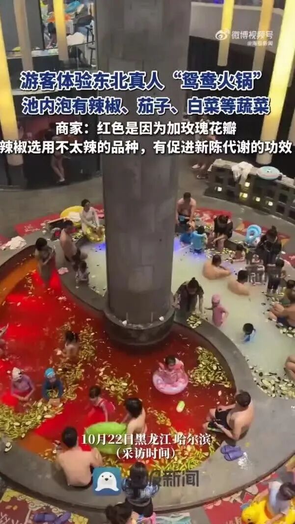 东北鸳鸯火锅洗浴体验,辣味与清淡并存,独特食材搭配双重汤底 游客体验东北特色的“鸳鸯火锅”洗浴,这种洗浴方式将火锅元素融入其中,独具特色,泡池中有辣椒、茄子、白菜等食材,一半红汤一半白汤,让人们在享受沐浴的同时,也能感受到火锅的美味,这种新颖的洗浴方式展现了东北饮食文化的独特魅力,吸引了众多游客前来体验。...