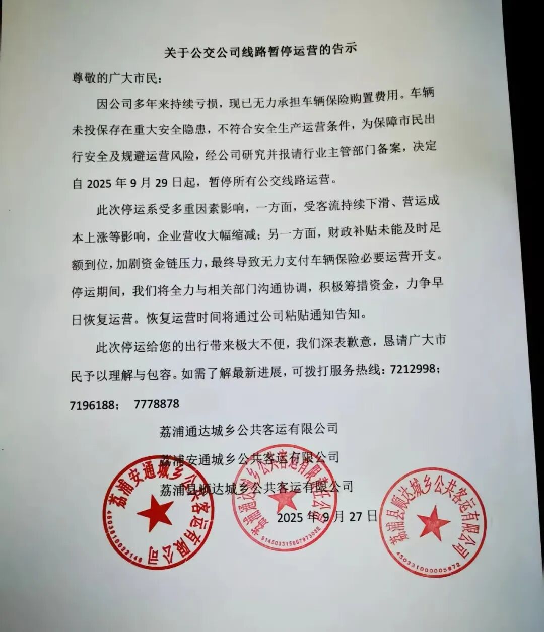 广西荔浦公交停运风波,财务补贴缺失导致保险无力承担,运管部门介入调查 广西荔浦公交公司因财务补贴未到位,无法承担保险费用,宣布全部停运,运管部门指出,公司未报备即停运属违规行为,公司员工发声,呼吁相关部门尽快解决补贴问题,以恢复公交运营,保障市民出行需求,此事引发社会关注,呼吁加强财政监管和公共交通服务保障,摘要的适当字数应在100-200字之间。...