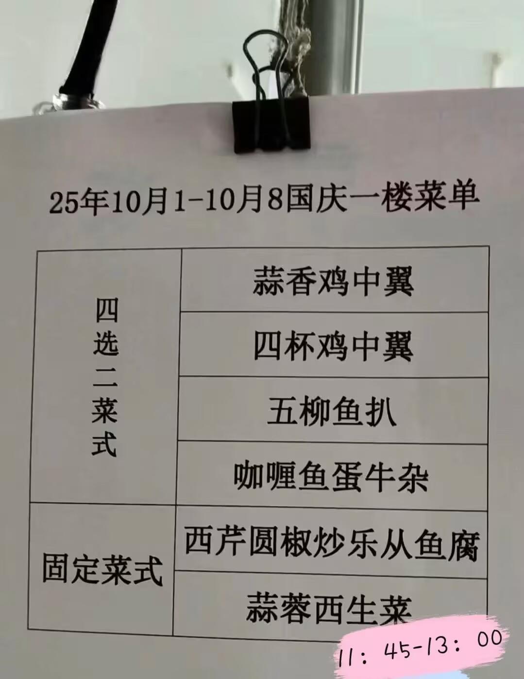 视频显示,许多人在食堂门口排队,挤满了整个廊道,队伍长达数十米,犹如热门景区门口。食堂门口张贴的饭堂每日菜谱显示,国庆假期有四种不同的套餐,每份均为20元,菜品有蒜香鸡中翼、四杯鸡中翼、五柳鱼扒、咖喱鱼蛋牛杂、西芹圆椒炒鱼腐和蒜蓉西生菜。