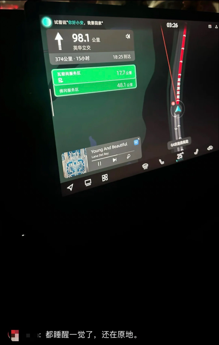 黄卡拉记得,车辆在凌晨3点左右行驶到G4京港澳高速英华立交附近时,车主们居然非常有默契地熄火睡觉了。“那里没有网络,又堵,还只有双车道。5点多我醒来时,车辆仍在原地纹丝未动。”更令人哭笑不得的是,一路途径的两个服务区都临时封闭,无法上厕所,“一家人从早上5点多醒来,一直憋到早上9点,才在第三个服务区解决了问题。”