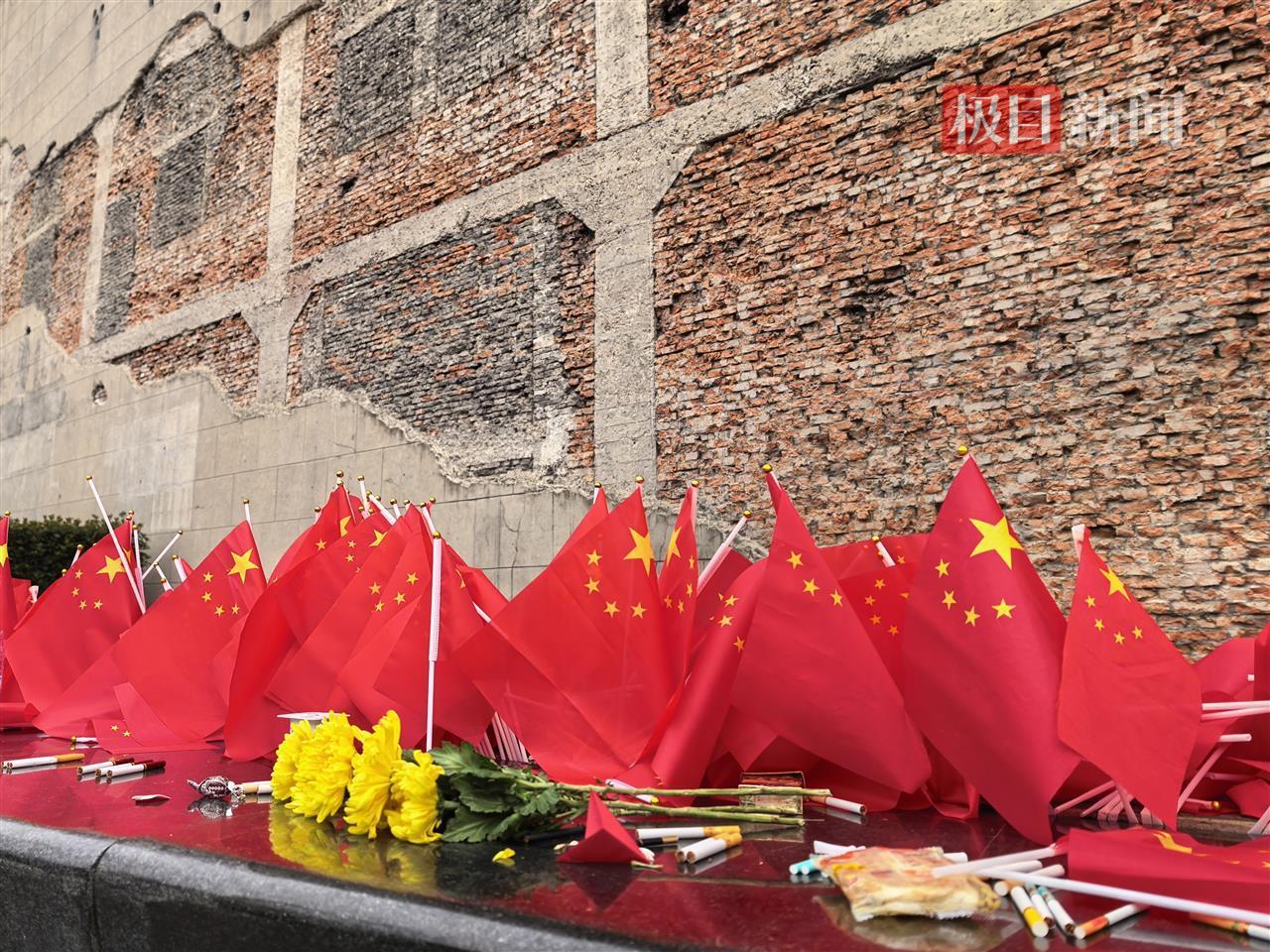 现场多名工作人员告诉极目新闻记者,这些手持小红旗和食物都是游客自发放置在此的,从假期前开始,便陆续有游客前来西墙边纪念。