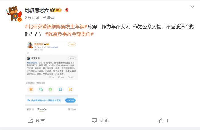 陈震于11时47分转发了北京交警的情况通报,但并未就车祸致歉。对此,网友纷纷发声喊话陈震,认为他作为公众人物应就此事致歉,有网友评论:“作为车评大V,公众人物不应该道歉吗?”还有网友表示,身为流量博主,不讲述事故的原因吗?对此,陈震回复称,以通告为准,以EDR(汽车事件数据记录系统)数据为准。