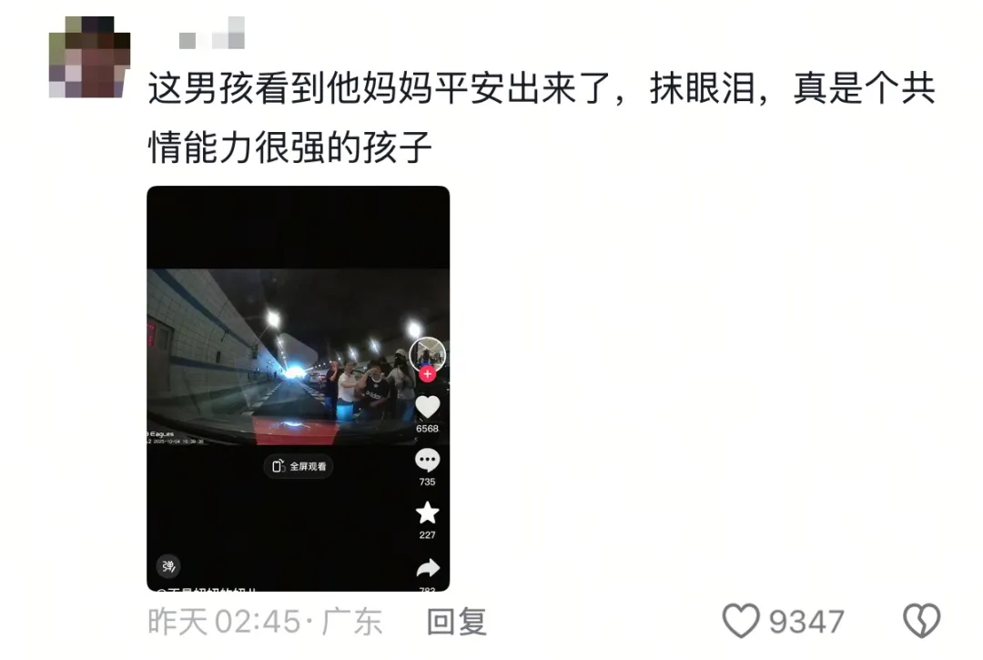 视频拍摄者称当时隧道里三车连撞,车辆内安全气囊全部弹出,其下车查看后发现驾驶位的孩子母亲已经昏迷不醒,车内还有一个儿子和两个女儿。视频显示:“一男孩跪在车子旁请求救援,车主们纷纷下车救人。”看到男孩求助后,多位热心路人立即停车上前查看,并协力将驾驶座上已昏迷的女子救出。