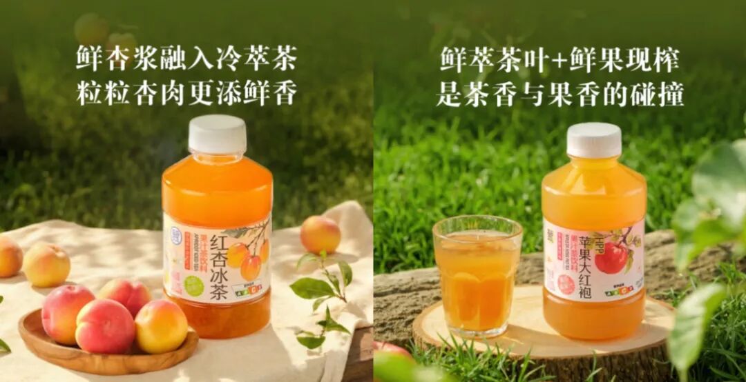 盒马自有品牌的冷藏线,今年则在去年全是1L大规格分享装的基础上,推出了一系列500mL自饮装有糖茶。其中包括HPP苹果大红袍果汁茶、红杏冰茶两款新品,均使用原叶冷萃茶制作。