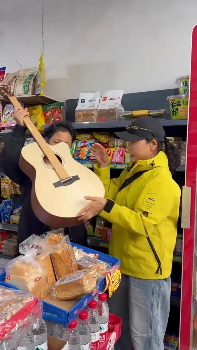 “淄博大燕儿”李晓燕今年48岁,从小喜欢音乐,初中毕业后,上世纪90年代在一家琴店里花100元“巨款”买了人生中的第一把吉他。随后,她又花费120元,到淄博市少年宫的夜校学习音乐。有一段时间,她一下班,就跟着淄博市一个乐队学琴。“我跟在乐队屁股后面,看人排练、弹琴。”李晓燕说。后来,李晓燕成家生子,忙于生活,便将爱好放下,一放就放了20多年。直到近些年开超市,稍微有些闲暇后,她又把吉他拿出来自己弹唱。由于晚上9点以后顾客不多,又要守着店,2025年3月后,她开始在直播间弹吉他、唱歌,直播的地点就在超市进门处。