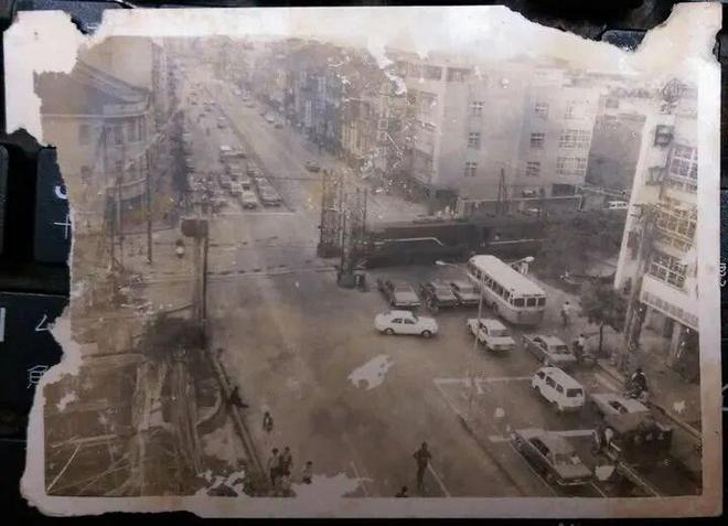 1974年的台北中山区老照片,图中可以看到一列淡水线火车正在通过南京西路平交道。(图/Meta@張哲生)