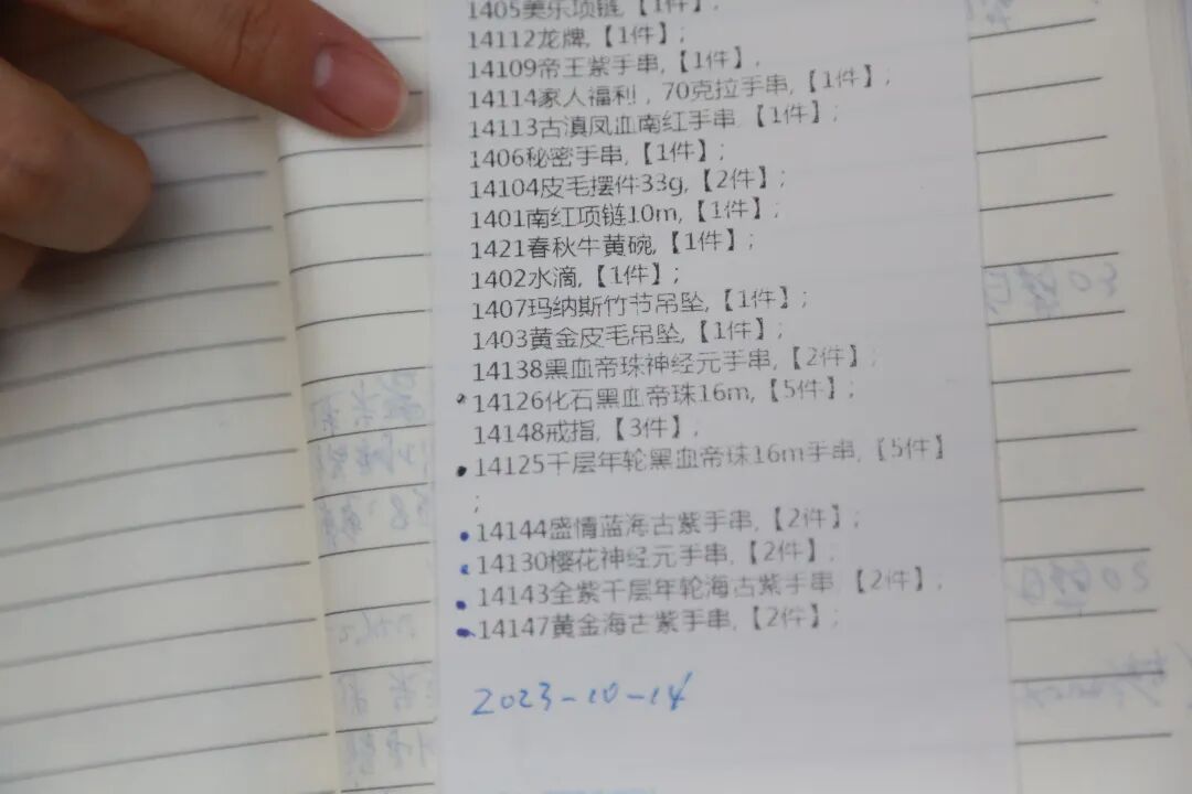 由于订单笔数太多,徐先生至今未统计完全。但徐先生带来了十本A5大小的笔记本,里面是老人一笔一画写下的“收藏档案”。每一页都分门别类,清晰记录着商品名称、购买店铺、克重、价格与日期,内容详实。