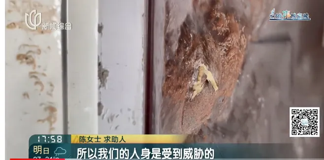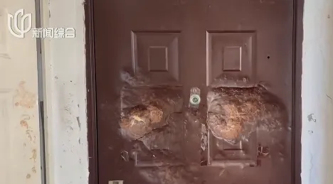 他是拿铁榔头敲的,我们那个门已经被敲得很薄了,就再稍微用力一点都能敲穿。我们家老母亲都已经90岁了,整天担惊受怕。她已经心脏病要复发了,那天晚上都要送医院了。我们阿姨都已经吓得哭了,都说要回老家去了。那我近90岁的老母亲怎么办,所以我们是不堪其扰。