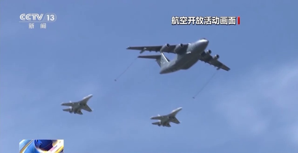 在飞行表演环节,运油-20A加油运输机与歼-16战斗机在空中组成编队飞行。随着运油-20A加油软管平稳伸出,三机精准完成对接,呈现了一场高难度的空中加油演示,展现出运-20平台出色的多任务扩展能力。