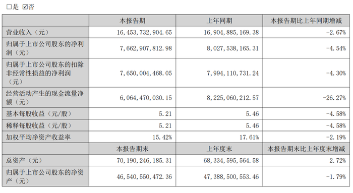 财报数据显示,今年上半年,泸州老窖实现营收164.54亿元,同比下降2.67%,实现净利润76.63亿元,同比下降4.54%。
