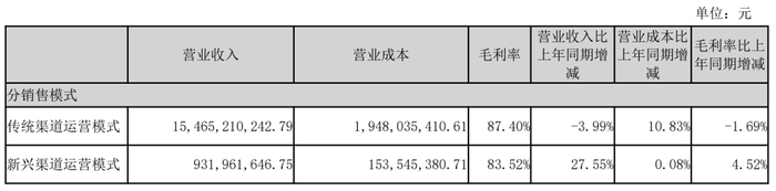 低度化突围和新渠道转型并肩同行。财报数据显示,泸州老窖传统渠道营业收入为154.65亿元,同比减少3.99%,毛利率为87.40%,同比减少1.69%。新兴渠道营业收入为9.32亿元,同比增长27.55%,毛利率为83.52%,同比增长4.52%。可以看出,新渠道增长明显,但规模相对较小,仅占总营收5.66%。