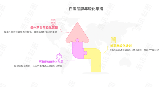 从头部酒企的年轻化策略来看,关键在于一个“系统化”。比如贵州茅台提出不能为“年轻化”而“年轻化”,并强调品牌价值体系的重塑;五粮液则组建了“年轻化专班”,从组织保障、产品创新、渠道拓展、传播升级和营销深化五个方面来推动品牌的年轻化布局;汾酒在2025年启动“汾酒年轻化1.0”计划,并提出“7个年轻化”。