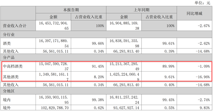 泸州老窖财报数据显示,作为营收主力的中高档酒上半年营收150.48亿元,同比微降1.09%,但销量同比增长13.33%,“量升价跌”现象显著。而定位大众市场的其他酒类营收13.5亿元,同比下滑16.96%,销量同比下滑6.89%。