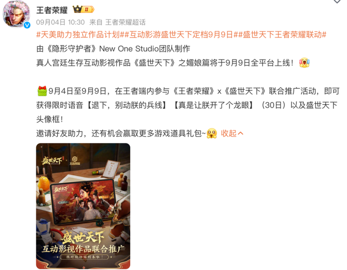 如果说半成品内容是《盛世天下》的产品硬伤,那么它在互动影游中不寻常的高调营销则进一步放大了玩家的反感。