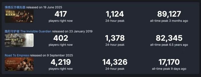 根据steamdb数据,其最高在线人数仅1.7万,而不管是前作《隐形守护者》,还是今年另一款热门互动影游《情感反诈模拟器》,最高在线人数都突破了8万。