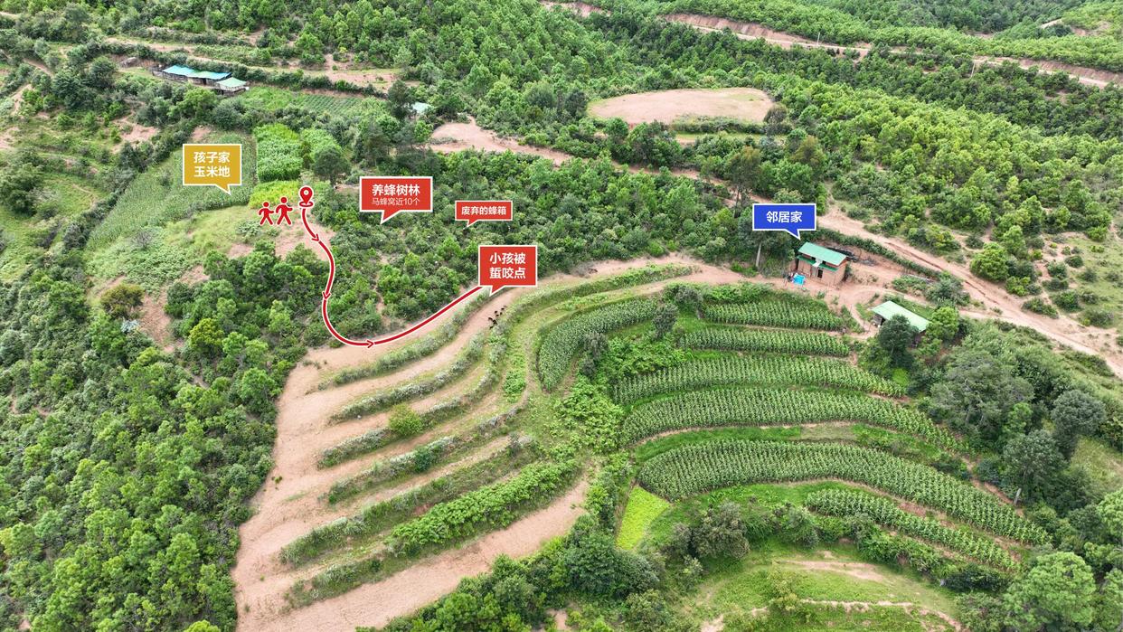 记者从牟定县委宣传部处了解到,事发树林面积约2亩,养殖区域范围未设置围栏,养殖区域入口设有铁丝网小门、有养蜂村民手写的木制警示牌。这个入口并非位于与李正香家玉米地相邻的左上角,而位于与一条土路相邻、面向树林主人家的右下角。